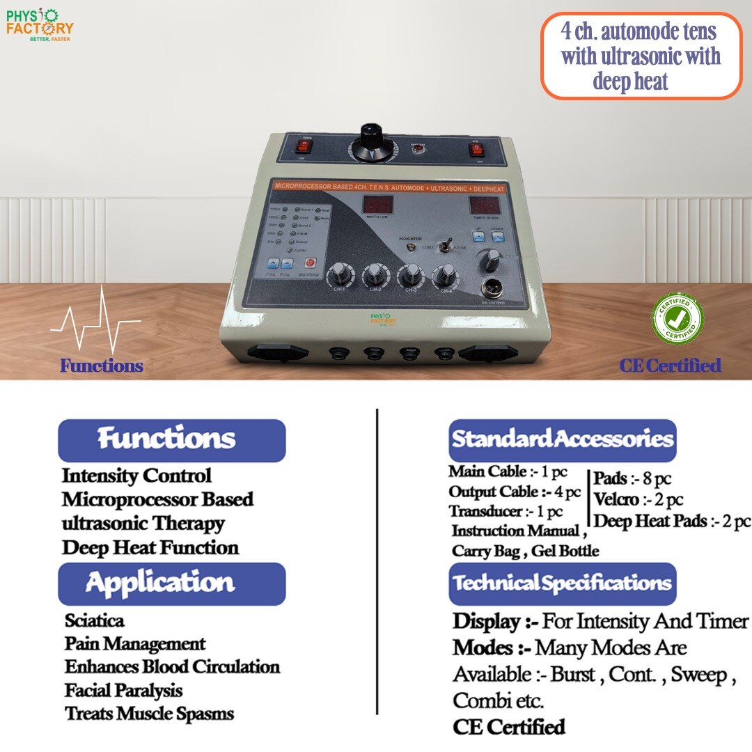 Multi-therapy physiotherapy machine featuring 4 Channel TENS, Ultrasonic Therapy, and Deep Heat – perfect for pain relief, muscle stimulation, and rehabilitation treatments. 📝 Full Description: This 4 Channel TENS with Ultrasonic & Deep Heat combo unit is a versatile and professional-grade physiotherapy device. Designed for pain relief, muscle stimulation, and deep tissue healing, it offers three therapies in one. The 4-channel TENS allows treatment of multiple areas simultaneously, while the Ultrasound therapy aids in reducing inflammation and swelling through micro-vibration. The Deep Heat modality improves blood circulation, promotes relaxation, and speeds up healing. Widely used in clinics, rehabilitation centers, and for at-home care, this combo machine is an essential tool for physiotherapists. 🔧 Key Features: 4 Independent TENS Output Channels 1 MHz Ultrasonic Therapy (Continuous & Pulsed Mode) Deep Heat Therapy with Temperature Control Digital Timer & Intensity Control ABS/Fiber Body – Durable & Portable Simultaneous multi-area treatment Ideal for Back, Shoulder, Knee, Neck & Joints ⚙️ Specifications: TENS Output: 4 Channels Ultrasonic Frequency: 1 MHz Deep Heat: Thermal Output with Intensity Adjustment Modes: Continuous / Pulsed / Variable Power Supply: AC 220V, 50Hz Display: Digital Timer & Settings Panel Weight: Approx. 4–5 kg Body: ABS or Fiber (as per model) 🎯 Applications: Chronic and acute pain relief Muscle spasms and joint stiffness Swelling and inflammation reduction Cervical & Lumbar Spondylitis Post-surgery muscle recovery Frozen shoulder, Sciatica, Arthritis