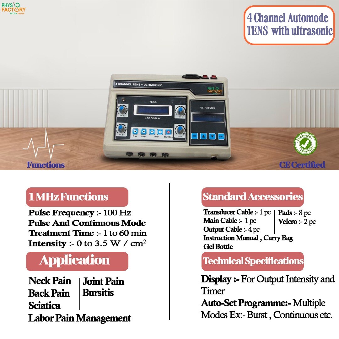Advanced 4-Channel TENS with Ultrasonic therapy device, designed for effective pain management and muscle stimulation, housed in a durable ABS body. This 4 Channel TENS + Ultrasonic Unit is a powerful dual-modality machine combining Transcutaneous Electrical Nerve Stimulation (TENS) and Ultrasonic Therapy in one unit. It delivers effective pain relief, reduces inflammation, and accelerates soft tissue healing. Built with a high-quality ABS plastic body, it’s lightweight, easy to carry, and ideal for clinical as well as personal use. The four-channel output allows simultaneous treatment on multiple muscle groups or joints, while the digital ultrasonic section ensures deep therapeutic penetration. 🔧 Key Features: 4 Independent TENS Channels Ultrasonic Therapy Mode for deep healing Clear LCD Display for both sections ABS Plastic Body – Lightweight yet sturdy Frequency & Timer Adjustment Ergonomic Control Panel with push buttons Compact & Portable Design ⚙️ Specifications: Channels: 4 TENS Output Channels Ultrasound Head: 1 MHz frequency Body Type: ABS Plastic Display: Dual LCDs (TENS + Ultrasonic) Timer: 0–60 Minutes adjustable Power Supply: 220V AC, 50Hz Mode Control: Frequency, Program, Timer, Start/Stop Ultrasonic Output: Continuous and Pulsed 🎯 Applications / Uses: Muscle & Joint Pain Relief Frozen Shoulder & Cervical Issues Sciatica & Nerve Disorders Tendonitis & Bursitis Sports Injuries & Swelling Arthritis & Spondylitis Post-Surgical Recovery