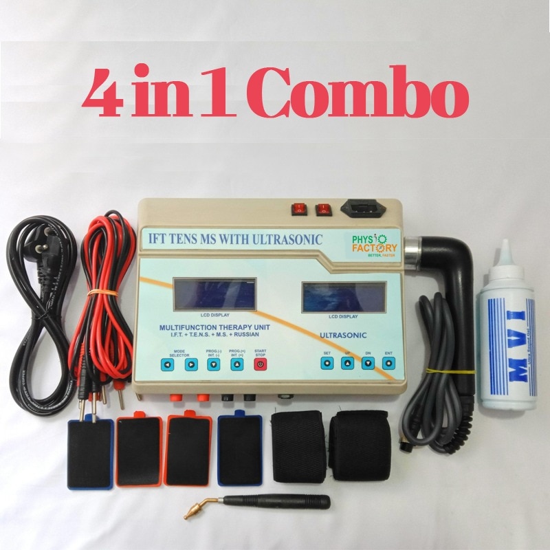 A multifunctional physiotherapy unit with IFT, TENS, MS & Ultrasonic therapy in one compact device. Built in ABS body for lightweight and portable use. The IFT TENS MS Ultrasonic 4-in-1 Combo is a compact and versatile therapy unit designed for pain relief, muscle stimulation, and deep tissue healing. This device combines Interferential Therapy (IFT), Transcutaneous Electrical Nerve Stimulation (TENS), Muscle Stimulator (MS), and Ultrasonic Therapy in a single system. Its ABS body makes it lightweight and portable, ideal for clinics, physiotherapy centers, and home care use. Includes LCD display and easy control panel for effective treatment customization. 🔧 Key Features: 4 Therapies in 1 Device: IFT, TENS, MS & Ultrasonic Dual LCD Display – Separate screens for therapy modes Preset & Manual Modes – Easy customization ABS Plastic Body – Lightweight & shockproof User-Friendly Operation – Ideal for professionals and beginners Comprehensive Accessories Kit – Pads, leads, straps & gel included ⚙️ Specifications: Therapies: IFT, TENS, MS, Ultrasonic Display: Dual LCD Digital Body Material: ABS Plastic Ultrasound Frequency: 1 MHz IFT Carrier Frequency: 4 kHz Modes: Continuous / Burst / Sweep / Manual Timer: Adjustable Input Power: 220V AC, 50Hz Accessories: Electrodes, Pads, Wires, US Head, Gel 🎯 Applications / Uses: Chronic & Acute Pain Relief Sciatica, Arthritis, Frozen Shoulder Muscle Spasm Reduction Soft Tissue Healing Facial & Beauty Therapy (Ultrasound) Post-Surgery Rehabilitation