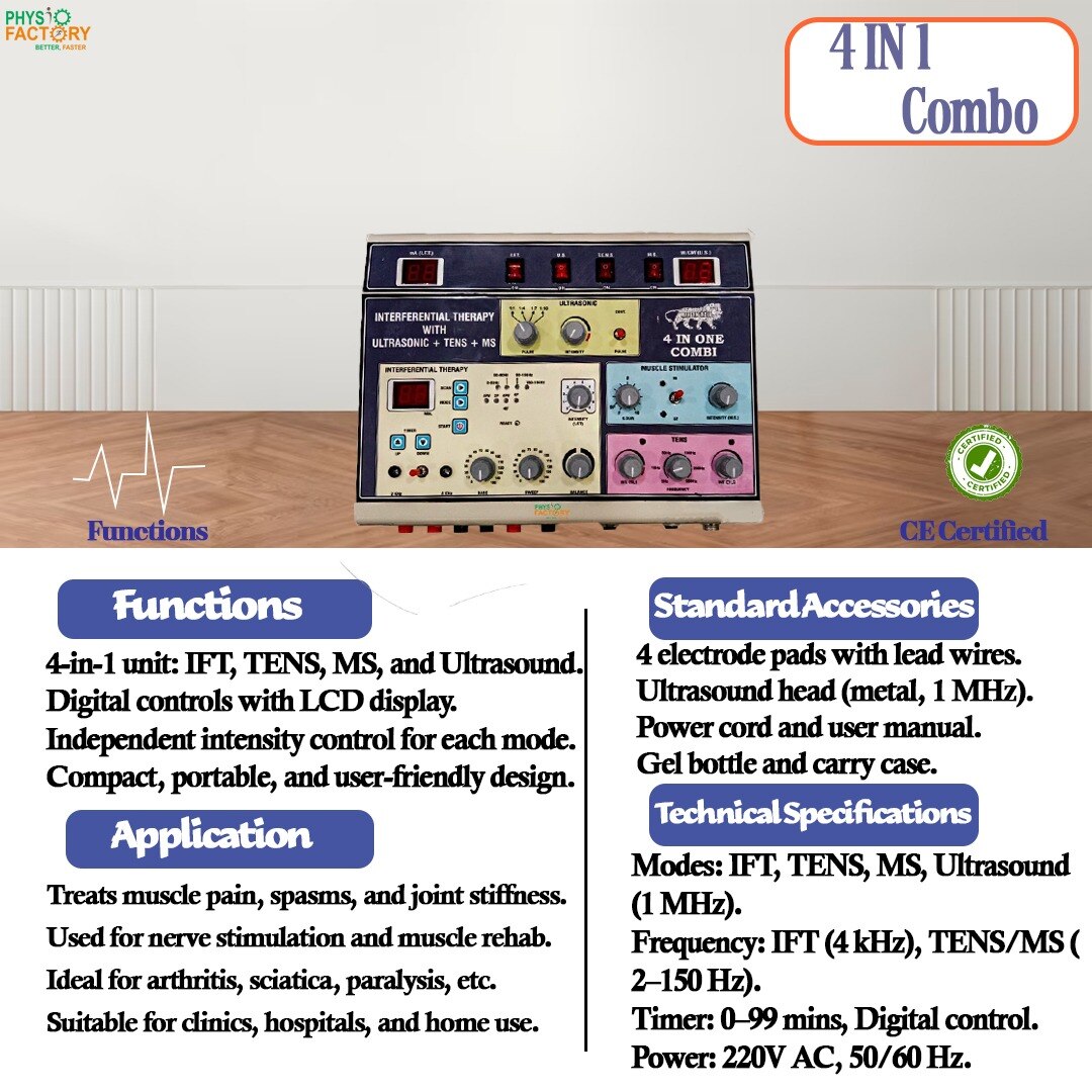 Multifunctional 4-in-1 Combo Physiotherapy Machine with IFT, TENS, Muscle Stimulator, and Ultrasound Therapy – Ideal for complete pain management and rehabilitation. This 4 in 1 Combi Therapy Machine is a professional-grade unit combining Interferential Therapy (IFT), Ultrasound Therapy, TENS, and Muscle Stimulator (MS) in a single compact system. It is ideal for pain relief, muscle strengthening, and inflammation reduction, widely used in physiotherapy clinics and hospitals. With individual controls for each modality, this machine ensures targeted therapy for various conditions like arthritis, frozen shoulder, muscular spasms, and post-operative recovery. 🔧 Key Features: All-in-one physiotherapy machine: IFT, TENS, MS, Ultrasonic Separate control knobs for each modality Metal body with durable finish Digital displays for intensity and time 1 MHz Ultrasound Therapy with adjustable pulse & intensity 2 & 4 pole IFT with sweep, base, and balance settings TENS with dual channel & frequency control MS with adjustable surge duration and intensity Easy to use & maintain ⚙️ Specifications: IFT Frequency: 2 KHz, 4 KHz Ultrasound Frequency: 1 MHz TENS Frequency: 2–200 Hz Muscle Stimulator Output: Adjustable mA Modes: Continuous & Pulse (Ultrasound), Sweep/Base (IFT), Timer Display: LED digital display for timer and power output Timer: 0–99 mins Power Supply: 220V AC, 50Hz Body Type: Heavy-duty metal case Ports: Individual outputs for each modality 🎯 Applications / Uses: Lower back pain Cervical spondylosis Frozen shoulder Sciatica Knee pain & arthritis Tennis elbow Muscular atrophy Paralysis rehab Ligament injuries Sports physiotherapy