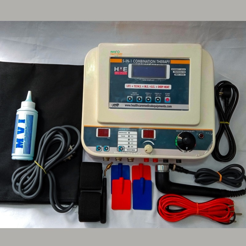 Compact and durable 5-in-1 physiotherapy combo machine featuring IFT, TENS, MS, Ultrasonic, and Deep Heat—all enclosed in a strong fiber body for long-term clinical use. 📝 Full Description: The 5 in 1 Combo Physiotherapy Machine is an all-in-one device combining Interferential Therapy (IFT), Transcutaneous Electrical Nerve Stimulation (TENS), Muscle Stimulator (MS), Ultrasonic Therapy (US), and Deep Heat Therapy in a single fiber body unit. This machine is ideal for pain management, muscle rehabilitation, joint stiffness relief, and soft tissue healing. Its fiber body ensures lightweight handling, durability, and easy portability, making it perfect for clinics, physiotherapy centers, and home visits. Each modality can be operated independently or in combination, offering customized treatment plans for different patient needs. 🔧 Key Features: 5 Therapies in 1 Unit: IFT, TENS, MS, US, Deep Heat Strong Fiber Body: Durable, lightweight, and easy to clean User-Friendly Interface: Simple controls with clear indicators Independent Therapy Operation: Each modality can be used separately Compact Design: Ideal for space-saving clinical setups Portable: Suitable for mobile physiotherapy services ⚙️ Specifications: Body Material: High-grade Fiber Power Supply: AC 220V, 50 Hz Ultrasound Frequency: 1 MHz IFT Frequency: 4 kHz Base Output Channels: 2–4 for TENS/MS Deep Heat: Controlled via adjustable intensity knob Dimensions: Compact size for easy placement Weight: Approx. 5–6 kg 🎯 Applications: Pain Relief Therapy – joint pain, back pain, neck pain Muscle Strengthening & Rehab Soft Tissue Healing & Inflammation Reduction Post-operative Recovery Support Sports Injury Management Neurological and Orthopedic Rehab
