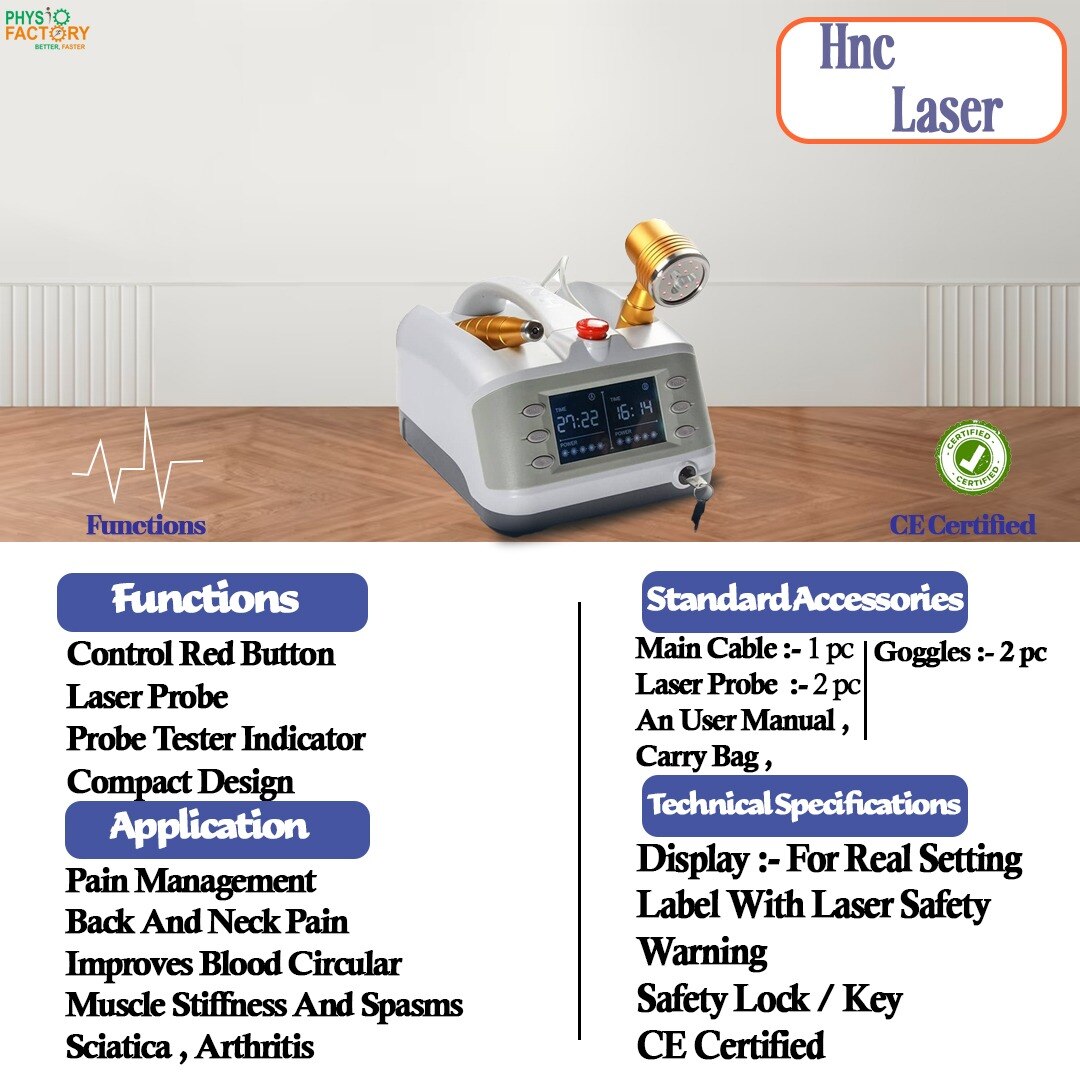 Portable HNC Laser Therapy Machine for pain relief, muscle recovery, and physiotherapy treatments. Ideal for clinics and home use. The HNC Laser Therapy Machine is a compact and advanced cold laser (LLLT) device used in physiotherapy for treating pain, inflammation, and soft tissue injuries. With dual wavelengths (650nm & 808nm), it delivers effective low-level laser therapy without heat or side effects. The machine is user-friendly, portable, and designed for deep penetration into muscles and joints to accelerate healing. Its sleek ABS body and digital display make it perfect for clinical or personal use. 🔹 Features: Cold Laser Technology (LLLT) Dual wavelength output – Red (650nm) & Infrared (808nm) Class 3B Laser – safe and effective Adjustable power settings Built-in treatment timer LCD screen for easy operation Compact, portable, and lightweight design ABS durable body Suitable for continuous or pulsed mode Non-invasive and drug-free therapy 🔹 Application: Muscle and joint pain Frozen shoulder Tennis elbow Sciatica Neck and back pain Arthritis Sports injuries Nerve regeneration therapy Physiotherapy clinics and home therapy