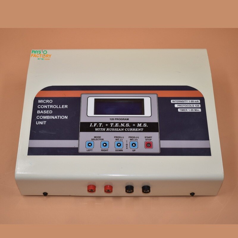 Advanced 3‑in‑1 electrotherapy machine featuring 125 pre-set programs (70 IFT + 30 TENS + 25 MS), perfect for deep pain relief, muscle recovery, and rehabilitation—ideal for clinics & home use. The 3‑in‑1 IFT + TENS + MS Machine combines three therapeutic modalities in one versatile unit with 125 pre-set programs to address diverse conditions: ✅ 70 IFT Programs — Treats inflammation, pain, edema, and muscle spasms with optimized medium-frequency currents ✅ 30 TENS Programs — Offers neuropathic and acute pain relief with adjustable low-frequency pulse settings ✅ 25 MS Programs — Supports muscle strength, endurance, and tissue healing through neuromuscular stimulation 🔁 Why 125 Programs Matter: Condition-focused presets eliminate setup complexity—just select your focus area (e.g., knee pain, back spasm), dial intensity, and start. Dual channels allow treating two areas at the same time with independent intensity controls—efficient and practical LCD Display & Timer provide clear visibility of program, intensity, and duration 🎯 Ideal For: Chronic/acute musculoskeletal pain (back, neck, knees) Arthritis, sciatica, and joint pain Muscle re-education and post-operative rehab Sports injury recovery and circulation improvement ✅ Complete Kit Includes: Unit, electrode pads with lead wires, power adaptor, and user manual This compact, drug-free therapy solution is perfect for physiotherapy clinics and home use—safe, effective, and proven