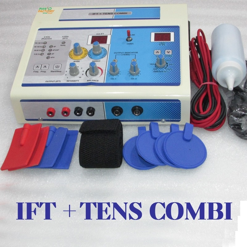 Dual-channel IFT + TENS combo machine designed for clinical physiotherapy use. Ideal for pain relief, muscle stimulation, and rehabilitation therapy with advanced features and accessories. This IFT + TENS Combi Machine by Physio Factory is a professional-grade physiotherapy device that combines Interferential Therapy (IFT) and Transcutaneous Electrical Nerve Stimulation (TENS) in one unit. Designed to treat muscle pain, joint disorders, sciatica, arthritis, cervical, and back pain, the machine offers independent controls for IFT and TENS functions. Its user-friendly interface, adjustable intensity, frequency modes, and included accessories make it ideal for clinics, hospitals, and home physiotherapy use. ⭐ Key Features: Dual-mode operation: IFT & TENS Independent channel intensity control Frequency modulation and base/sweep time settings Digital timer & pulse width control Comes with pads, straps, wires, and gel bottle Heavy-duty design for continuous use ⚙️ Specifications: Type: IFT + TENS Combi Unit Modes: IFT, TENS Display: LED Digital