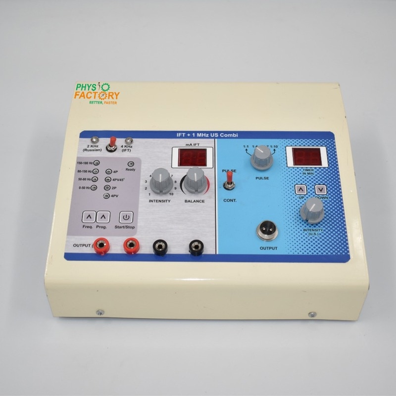 Hybrid IFT + 1 MHz ultrasound machine—provides deep-tissue pain relief, anti-inflammation, and accelerated tissue repair. Professional-grade, ideal for clinics and home physiotherapy. The IFT + 1 MHz Ultrasound Combo Machine integrates two powerful therapeutic modalities for comprehensive treatment. 🔎 Interferential Therapy (IFT) – uses medium-frequency currents that intersect to produce therapeutic low-frequency beats deep within tissues. Provides pain relief, swelling control, muscle stimulation, and improved circulation 🔊 1 MHz Ultrasound (US) – emits sound waves that generate thermal and non‑thermal effects like increased blood flow, collagen elasticity, reduced muscle spasm, and enhanced tissue repair ✅ Why Combine? When used together, they offer synergistic benefits: Reduced IFT intensity for same effect, lowered discomfort Enhanced analgesia and accelerated healing in conditions like osteoarthritis and fibromyalgia Taylor & Francis Online 🔧 Adjustable Settings: • IFT – selectable carrier frequency, sweep options, adjustable intensity • US – continuous/pulsed modes, timer, intensity control 🎯 Ideal For: • Musculoskeletal pain (back, neck, shoulder, joints) • Soft tissue injuries (tendonitis, bursitis) • Osteoarthritis, fibromyalgia • Post-operative rehabilitation • Trigger point therapy ✅ Kit Includes: – IFT pad leads, ultrasound transducer, power cord, user manual This combo unit combines non-invasive, drug-free, and dual-action therapy in one compact unit—perfect for physiotherapy clinics and serious home users.