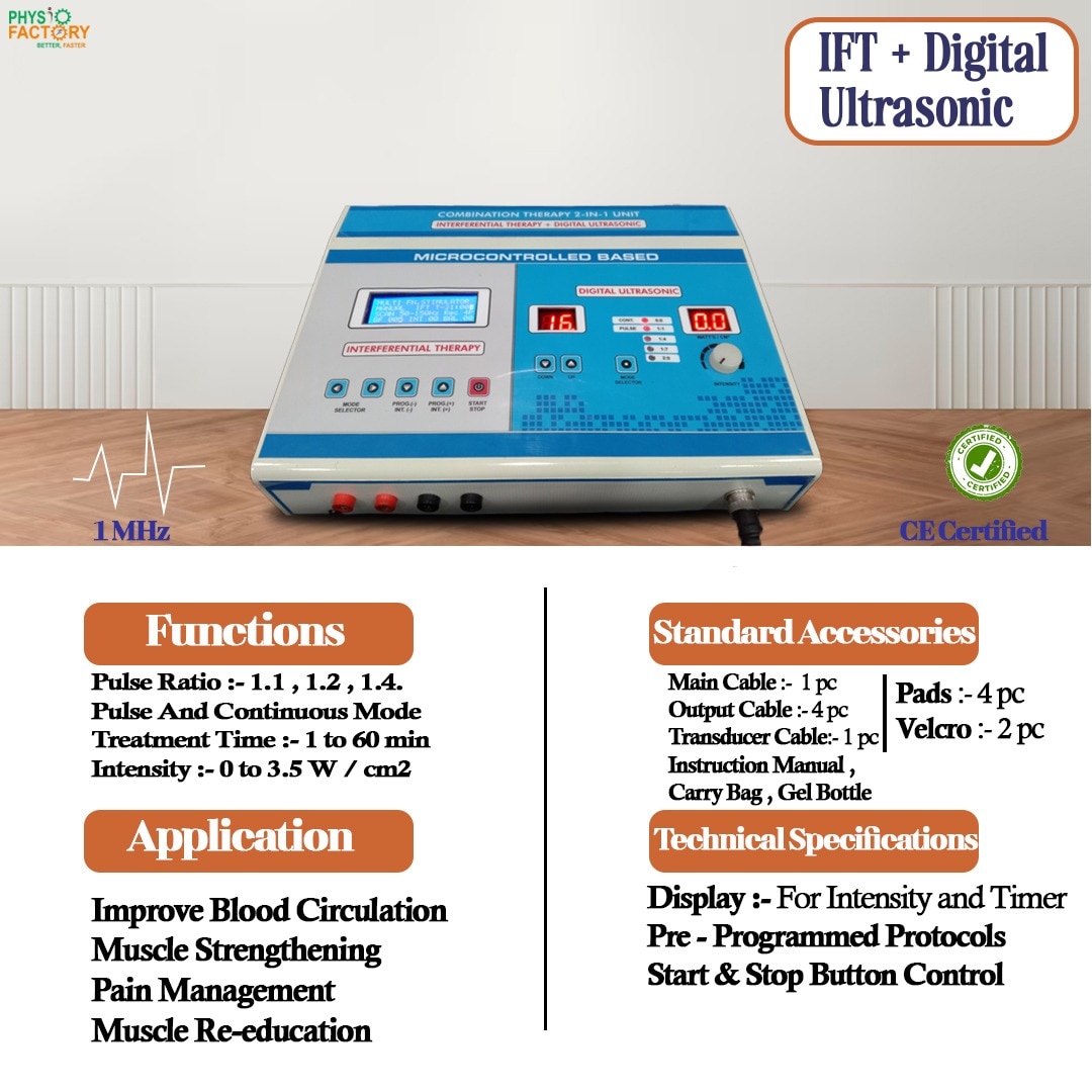 Advanced IFT + Ultrasonic Combo Machine β perfect for pain relief, muscle stimulation, and tissue repair through combined interferential and ultrasound therapy. π Full Description: This IFT with Ultrasonic Combo Machine is a professional-grade physiotherapy unit combining Interferential Therapy (IFT) and Ultrasound Therapy in one compact device. IFT therapy is ideal for chronic pain relief, muscle relaxation, and nerve stimulation, while ultrasound therapy enhances deep tissue healing, reduces inflammation, and improves blood circulation. Perfect for use in clinics, rehabilitation centers, and home physiotherapy, the machine offers adjustable frequencies, intensity controls, and preset therapy programs for personalized treatment. π§ Key Features: 2-in-1 Combo: IFT + Ultrasound therapy Ultrasound Frequency: 1 MHz IFT Channels: 2 or 4 output channels Digital or Analog control options Durable ABS or Metal body (as per model) User-friendly interface with easy controls Supplied with ultrasound applicator, electrodes, and lead wires Ideal for deep tissue pain relief and inflammation reduction βοΈ Specifications: Model: IFT + Ultrasonic Combo Unit Ultrasound Frequency: 1 MHz IFT Output: 2/4 channels (model-dependent) IFT Frequency Range: 2β150 Hz adjustable Modes: Continuous, Pulse, Burst Body Material: ABS Plastic / Metal Power Source: AC Weight: Approx. 3β4 kg Accessories: 1 Ultrasound head, 4 electrodes, 2 lead wires, power cord Treatment Areas: Back, Neck, Shoulders, Legs, Arms, Joints π― Applications: Pain relief for arthritis, joint pain, sciatica Soft tissue injury treatment Muscle spasm and stiffness relief Post-surgery rehabilitation Inflammation reduction and tissue healing Suitable for clinics, hospitals, and home therapy