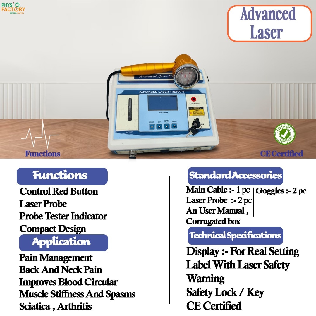 Advanced physiotherapy laser machine with LCD screen and multi-LED probe for pain relief, tissue repair, and inflammation reduction. 📝 Full Description: This Advanced Laser Therapy Machine is a professional-grade device used for pain management, wound healing, joint therapy, and physiotherapy rehabilitation. It uses low-level laser therapy (LLLT) technology with a multi-LED probe that emits laser light to promote cell regeneration, reduce inflammation, and relieve chronic pain. The machine comes with an easy-to-use LCD screen for selecting intensity levels, modes, and therapy duration. Suitable for clinical use, rehab centers, and sports therapy, this device offers non-invasive, drug-free therapy for multiple conditions. 🔧 Key Features: Low-Level Laser Therapy (LLLT) technology Multi-LED therapy probe for effective coverage LCD Display for clear settings and program control Adjustable intensity, timer, and mode selection Built-in probe tester Safety key lock operation Compact and durable design Ideal for chronic pain, sports injuries, arthritis, and muscle recovery ⚙️ Specifications: Display Type: LCD Digital Laser Type: Cold Laser / Low-Level Output Mode: Continuous / Pulsed Wavelength: Typically 650–850 nm (as per model) Input Power: AC Control: Programmable modes, timer, and intensity Probe Type: Multi-LED with ergonomic grip Weight: Approx. 3–4 kg Application Area: Joints, Muscles, Back, Neck, Knees, Shoulders 🎯 Applications: Pain relief (Back pain, Arthritis, Sciatica) Muscle spasm reduction Tissue repair and regeneration Joint inflammation and swelling Wound healing and post-surgical recovery Sports injury rehabilitation Physiotherapy and rehabilitation clinics