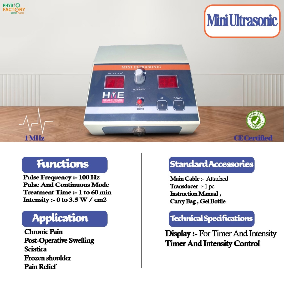Compact and effective Mini Ultrasonic Physiotherapy Machine for deep tissue healing, pain relief, and inflammation reduction. Ideal for clinic and home use. The Mini Ultrasonic Therapy Machine offers therapeutic ultrasound treatment in a compact and portable design. It is highly effective in promoting tissue healing, reducing pain, improving blood circulation, and softening scar tissues. This mini version is ideal for physiotherapists, home users, or mobile therapy setups. It uses ultrasonic waves (1 MHz or 3 MHz) to penetrate deep into the tissues, stimulating cellular repair and reducing inflammation — a non-invasive, drug-free solution for pain management. 🔧 Key Features: Portable and compact design Ultrasonic therapy (1 MHz or 3 MHz) Digital or analog display (as per model) Adjustable timer and intensity Ergonomic ultrasound applicator Silent operation, lightweight body Safe for clinical and home use ⚙️ Specifications: Ultrasound Frequency: 1 MHz (standard) or 3 MHz (optional) Intensity Range: 0.5 to 3 W/cm² Mode: Continuous and Pulse Timer: 0–30 minutes Body Type: Metal or ABS body (confirm your model) Display: Digital LED / Analog Power Supply: 220V AC, 50Hz Applicator Head: Aluminum / Ceramic head 🎯 Applications / Uses: Muscle and joint pain Frozen shoulder Soft tissue injuries Arthritis Bursitis and tendonitis Sciatica Scar tissue breakdown Sports injuries